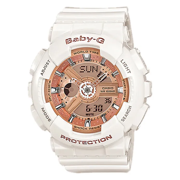 Casio Baby-G BA-110-7A1ER Ladies Rose Gold Digital Analog Dial White Resin Strap